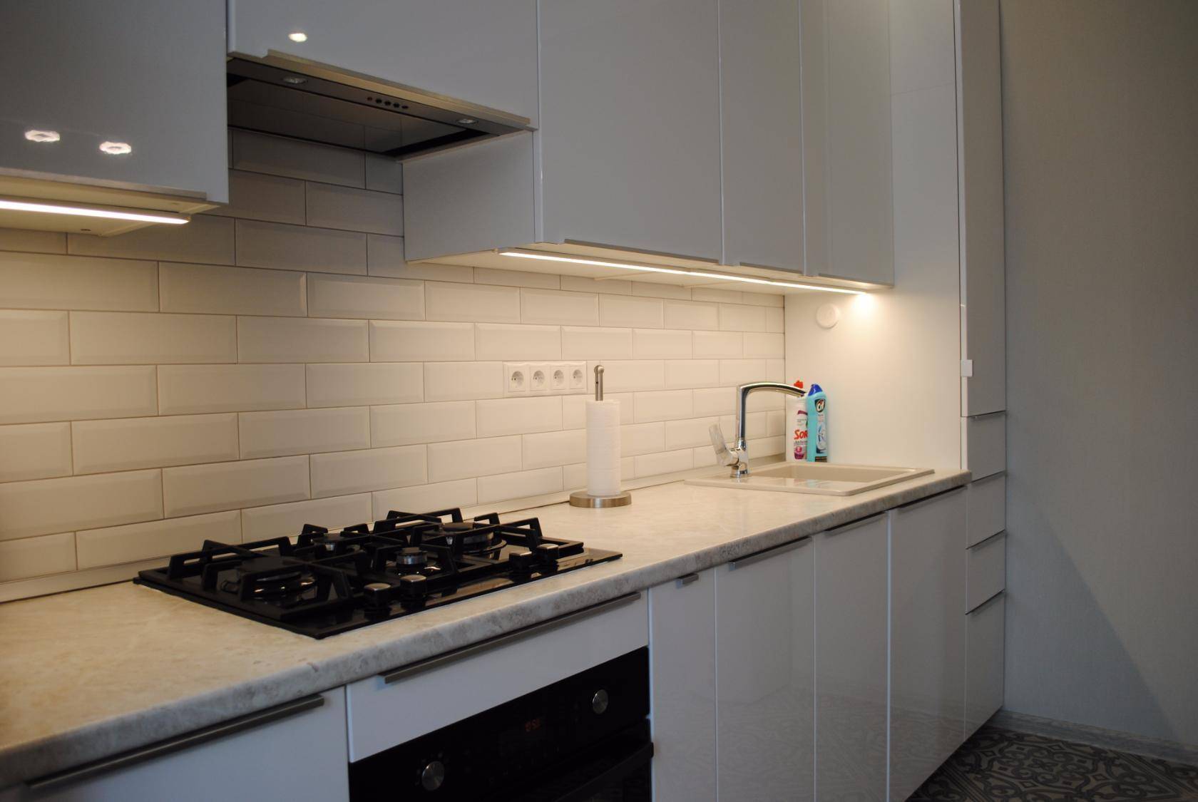 Что касается гарнитура, то выбирать стоит исключительно Г-образную или прямолинейную модель, которая не будет занимать слишком много места и не затруднит передвижение по кухне. От использования кухонного острова придется отказаться.