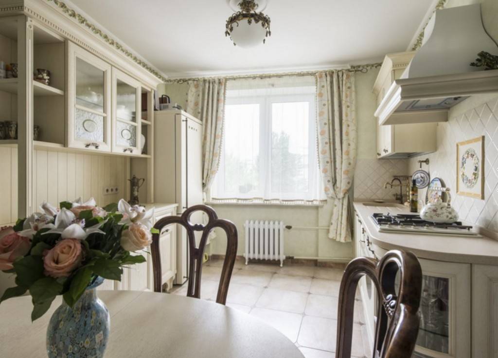 На маленькой кухне стоит отдать предпочтение современной классике или, так называемой, неоклассике. В этом случае лучше отказаться от многослойности, пышных и богато украшенных вариантов, а выбрать что-то более простое и сдержанное. Например, можно оставить всего один ламбрекен, если нет необходимости скрываться от яркого солнечного света, или повесить легкие гардины из тюля или органзы. Универсальным вариантом будут римские шторы однотонного дизайна или с неброским узором.