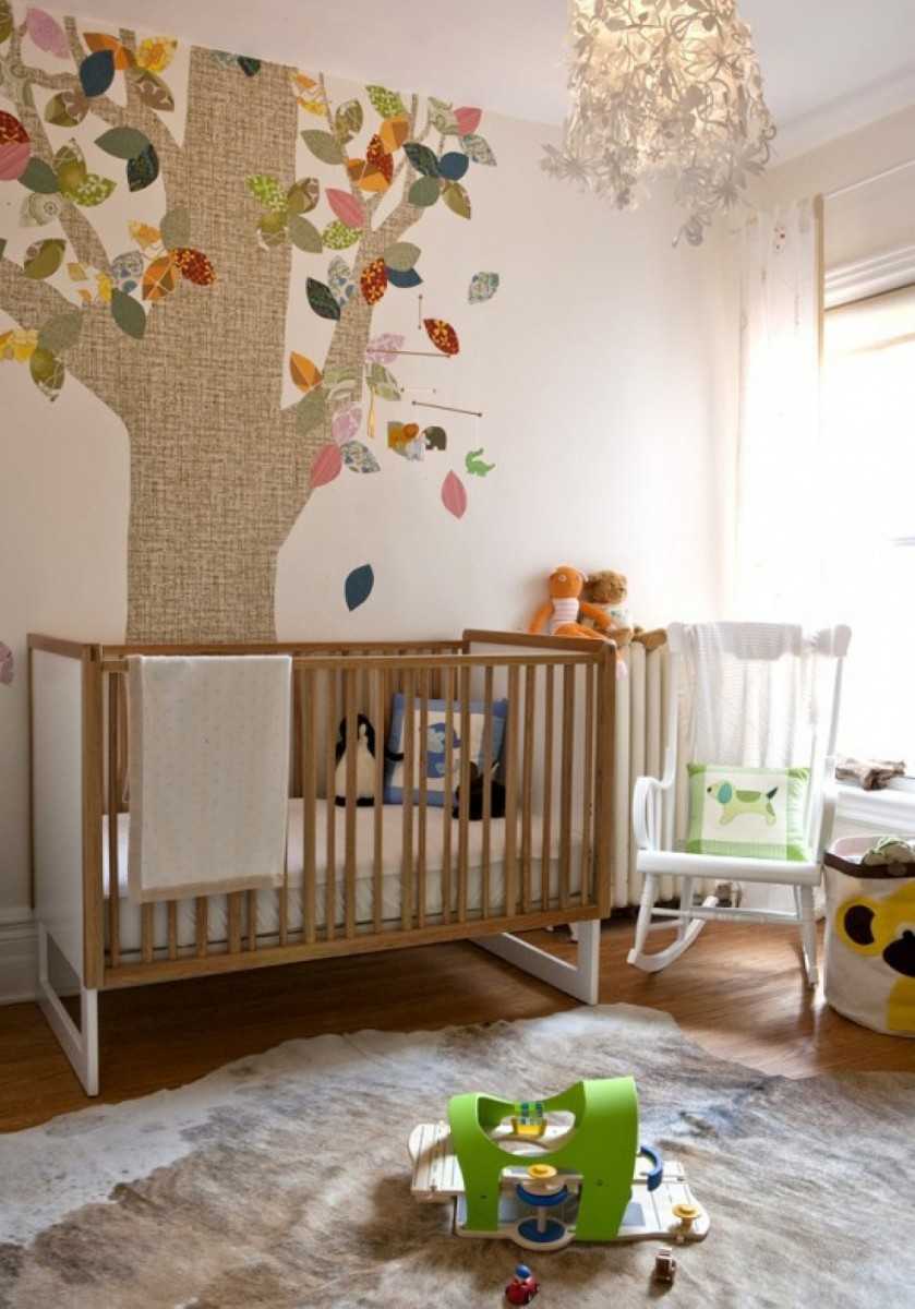 На фото наклейка в виде дерева на стене в детской комнате для новорожденного.