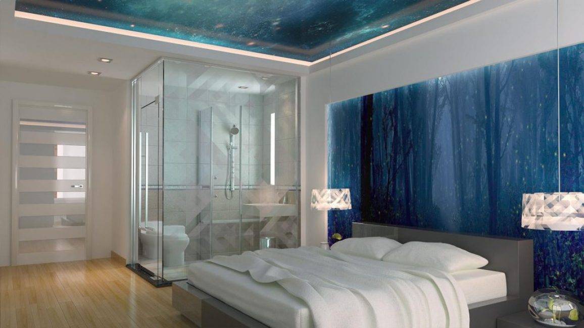 Белые матовые потолки практически невозможно отличить от отштукатуренной поверхности. Если в спальне классический дизайн и интерьер, то матовый потолок там будет смотреться органичнее. Дизайн матового потолка в классической спальне можно посмотреть на фото. Глянцевая поверхность отражает свет и переливается под определенным углом, поэтому их стоит использовать в комнатах, где не хватает естественного света. Также они подходят для спален в стиле хай-тек и минимализм. Такой дизайн часто предполагает использование контраста, к примеру, белый глянцевый потолок и темные матовые стены. На фото можно посмотреть принцип игры на контрасте в дизайне интерьера. Сатиновые потолки нечто среднее между матовой и глянцевой поверхностью, они рассеивают свет, но при этом не блестят. Именно поэтому их чаще всего выбирают для спальни. Благодаря идеально гладкой поверхности и мягкому рассеиванию света, сатиновые потолки лучше всего подходят для нанесения рисунка или имитации звездного неба. С точки зрения дизайна интерьера, сатин самый универсальный. Он хорошо смотрится и в классических, и современных интерьерах. Его часто выбирают для детских.