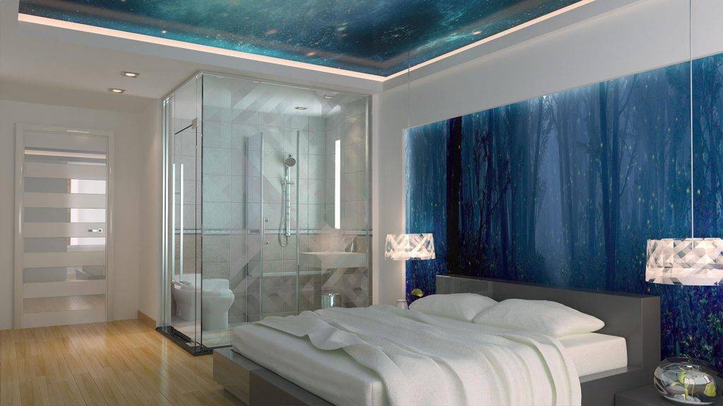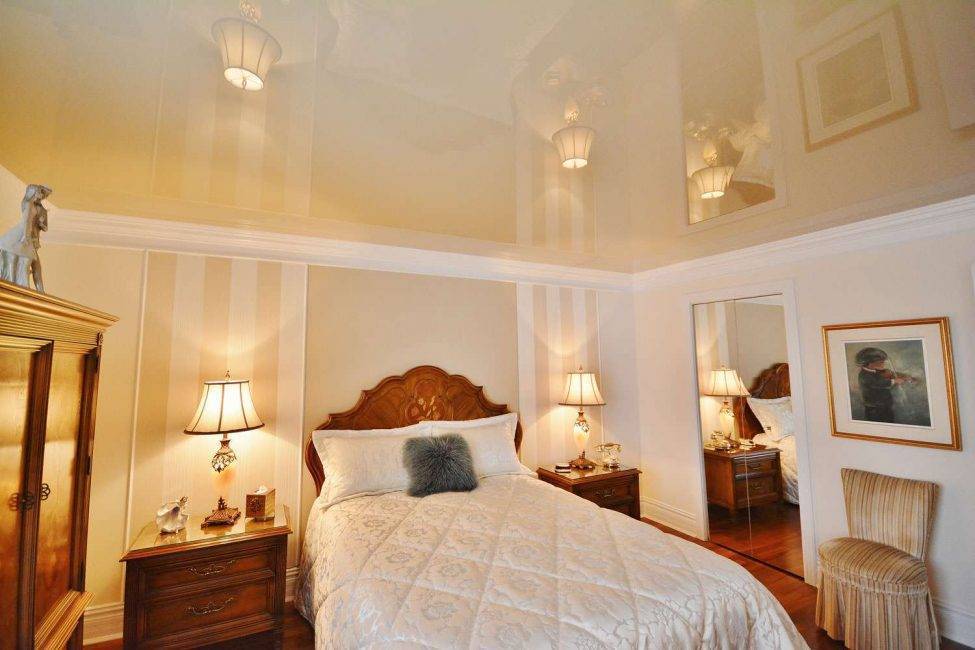 Стоит сказать, что натяжные потолки в спальне подразделяются на матовые ПВХ-пленки, сатиновые либо глянцевые. Свойства они имеют практически одинаковые – прослужат долго, они безопасны в быту, прочные и красивые