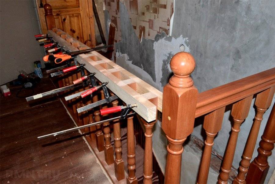 В верхней перемычке делают отверстия, которые чуть больше диаметра выбранных саморезов, но меньше диаметра шляпки. Шаг — от 50 см до 1 метра. Поручни подрезают, где это необходимо, подгоняют места стыков до идеального состояния. Устанавливают поручни на место, добившись идеального совпадения стыков, закрепляют их в таком положении струбцинами. Через отверстия в перемычке устанавливают крепеж. Снимают струбцины. Крепление поручня окончено, перила готовы к эксплуатации