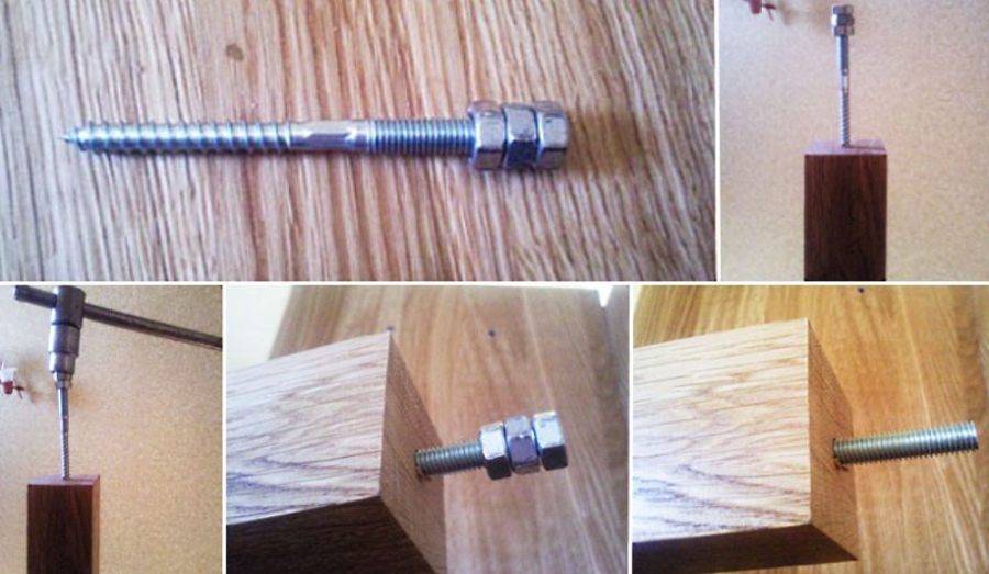 Лучше применять гайки, но помните, что этот способ установки балясин пригоден лишь для пород деревьев твердых сортов. Гайки требуется снять после вкручивания шпилек, столбы устанавливают также, но толщина шпилек должна быть 10 мм. В нижней ступени делают отверстие диаметром 7 мм и вкручивают в ступень столб, потом его выкручивают, шпильку оставив в ступени.