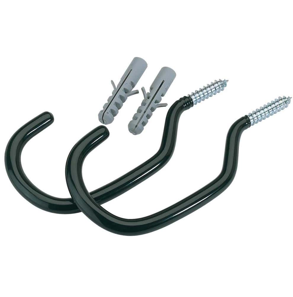 Это наиболее популярный способ закрепить велосипед на стене. Вполне подходит для параллельного и перпендикулярного размещения изделия. Встречаются крюки из пластика и металла. Лучше всего отдать предпочтение последним, так как они более надежны, крепче и долговечнее. Крюки весьма удобны при монтировании, для этого достаточно закрепить парочку изделий на длинные саморезы. Они могут удержать до 25 кг, что в 2 раза превышает вес обычной горной модели со стальной рамой. Осуществляется данное крепление велосипеда на стену за колесо или раму, также возможно применение других вариантов.