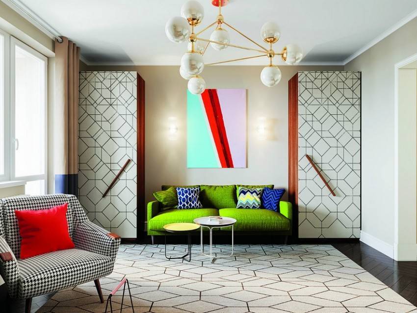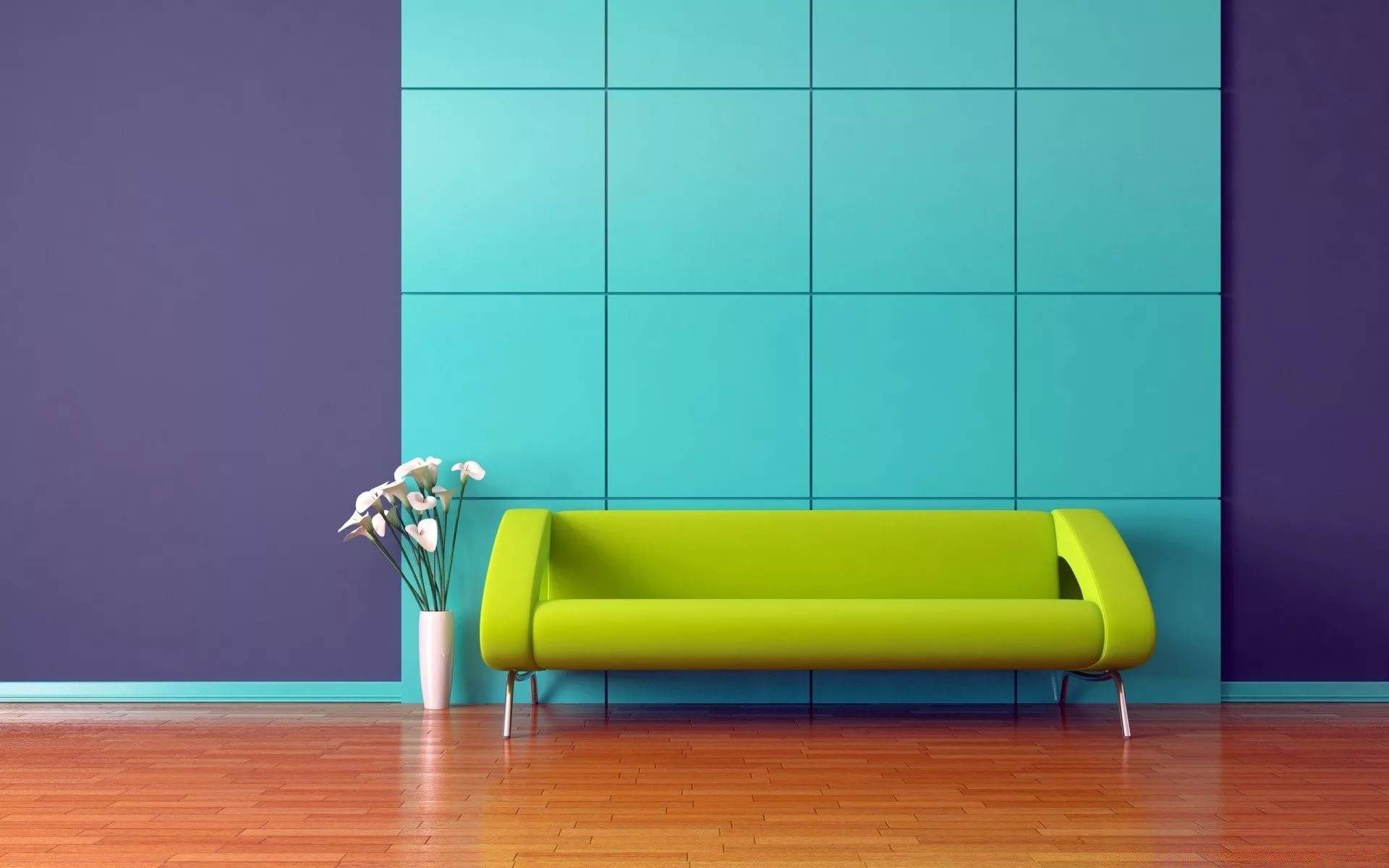 - Поп-арт — смелый стиль, приветствующий эксперименты. В интерьере можно встретить самые броские и вызывающие краски, их необычное смешение. Для дивана подходят сочный салатовый, яркий зеленый, нередко соединенные с цветом электрик. Для обивки используется различный текстиль, чаще бархат, а также кожа.