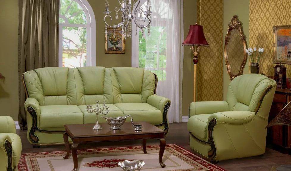 - Модель в викторианском стиле — это бархатный диван (возможен кожаный вариант) цвета травы или оливок. Форма отличается закругленностью, опорные элементы украшены резьбой, изящный декор присутствует на подлокотниках и спинке.