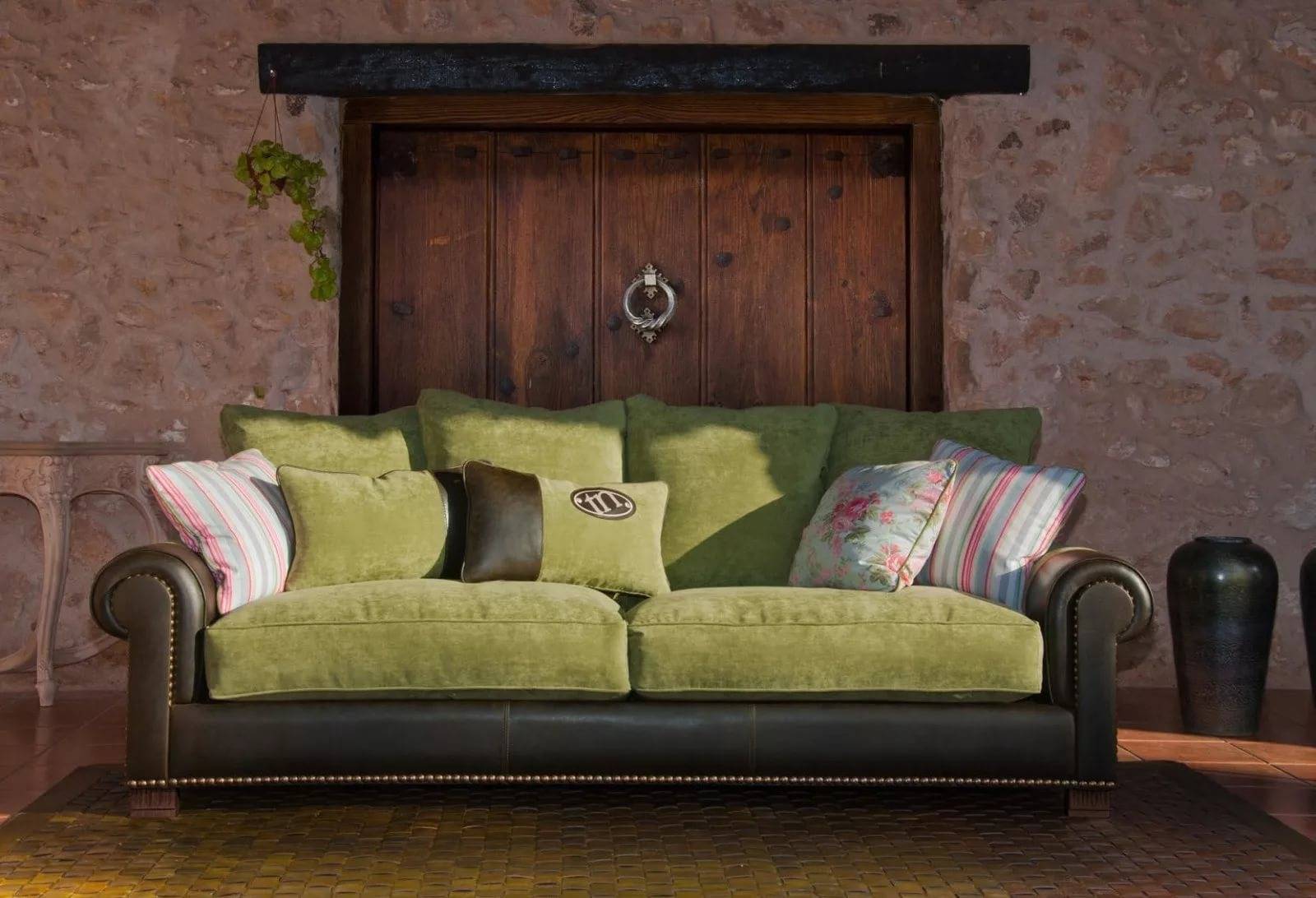 - Цвета, подходящие к стилю кантри: нежный зеленый, белый, песочный, все оттенки коричневого. Диван отличается характерным узором обивки, чаще всего это цветочный орнамент или клетка любого размера.