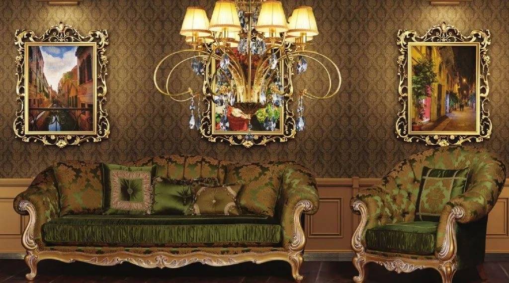 - Для барокко характерна громоздкая мебель с вычурными элементами декора и каркасом из дерева. Цвет обивки выбирают насыщенный зеленый или темный изумрудный, используются вставки и разводы золотого оттенка.