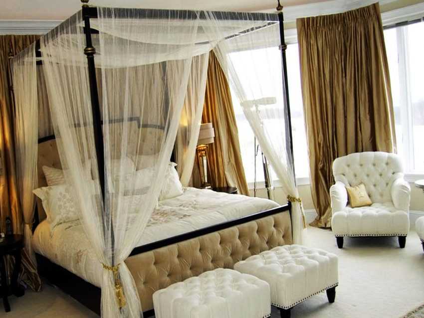 - Королевский. На четырех столбиках, желательно деревянных. Такие балдахины показывают в кино.