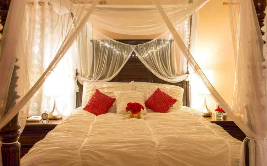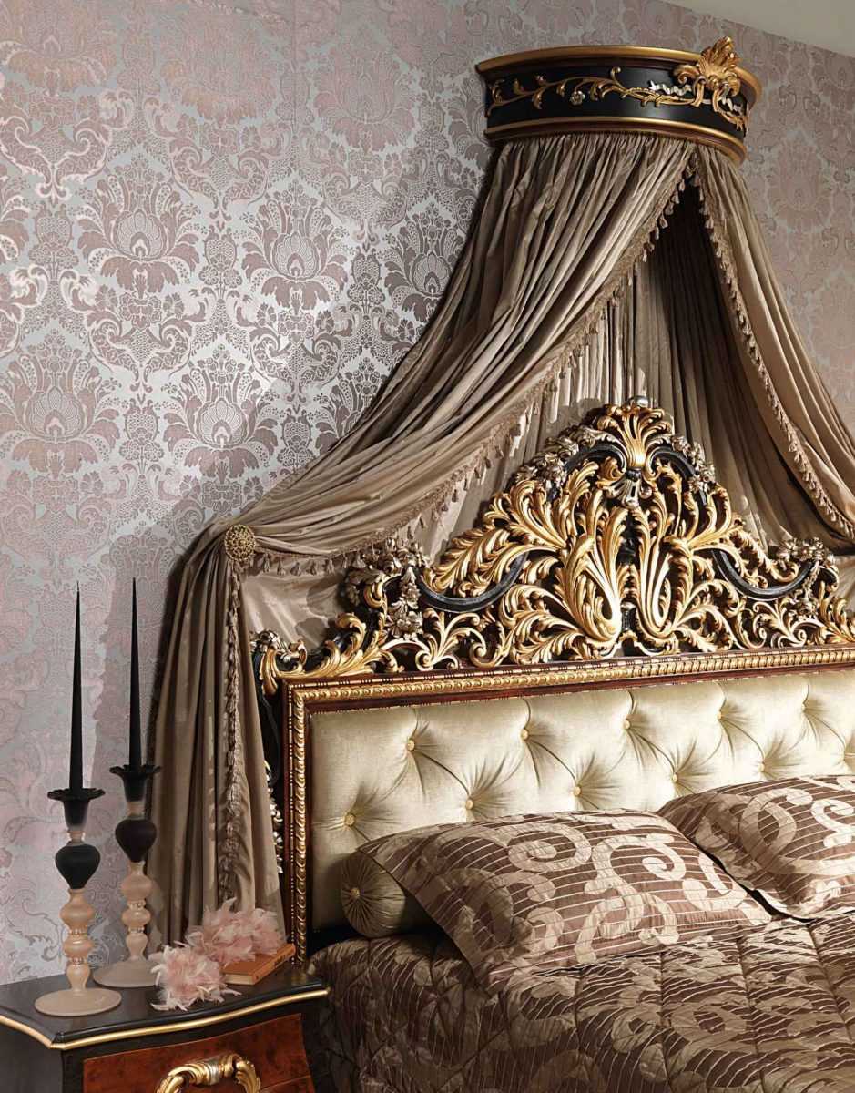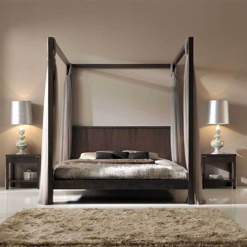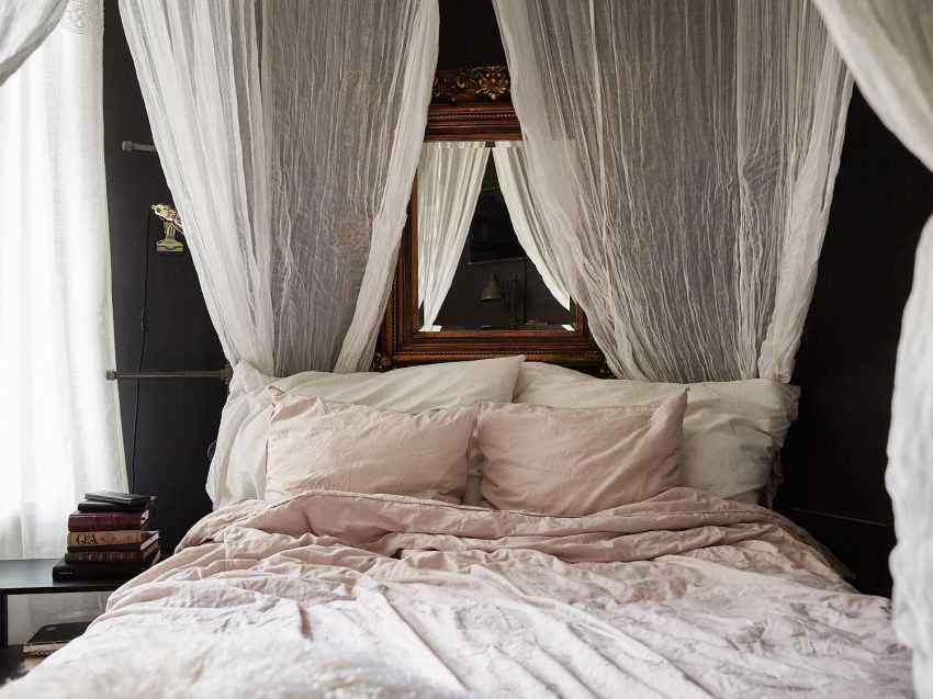 Балдахин – это классический способ обрамления изголовья кровати. Если стандартный балдахин свисает с четырех сторон кровати, то в городской квартире возможно оставить только два его полотна. Таким образом можно оформить изголовье кровати, стоящей около стены.