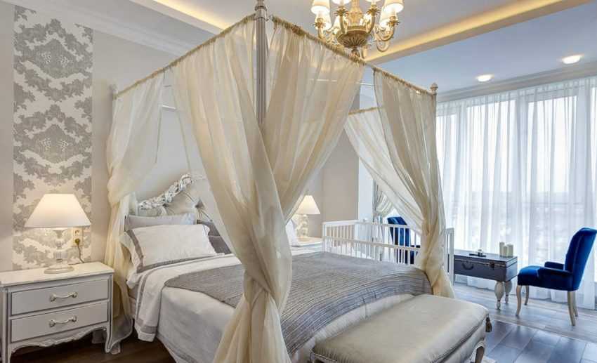 Функциональность спальни должна оставаться на прежнем уровне. Она должна отвечать требованиям взрослых членов семьи. Задача при установке детской кроватки заключается в выборе способа зонирования помещения – с помощью занавески, ширмы или декоративной перегородки. Это делается для того, чтобы ребенка ничто не отвлекало от сна.