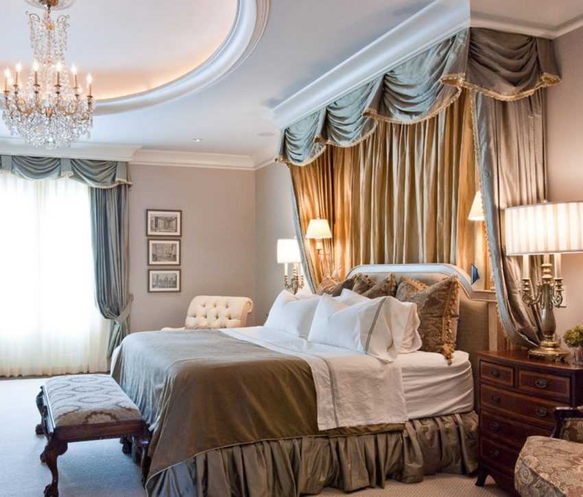 Балдахин может быть как классическим, тяжелым, обрамленным бахромой и кистями, так и минималистичным, выполненным из гладкой натуральной ткани.
