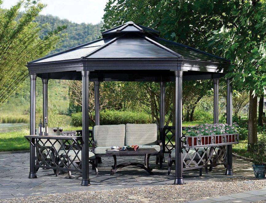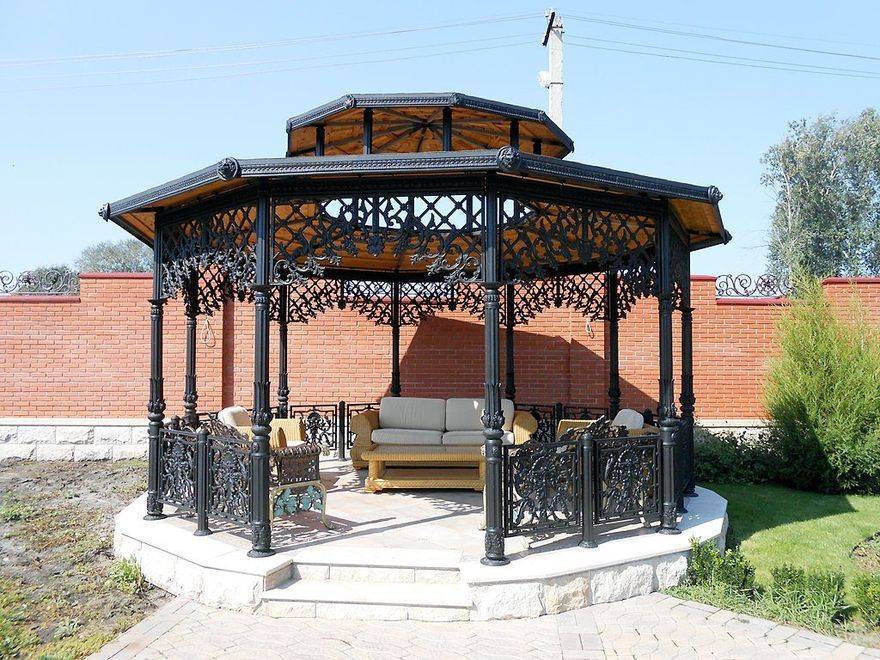 Следует учитывать, что металл при солнцепеке будет сильно нагреваться, и в беседке будет невыносимо жарко, поэтому важно позаботиться о месте установления – в тени, саду, под деревьями