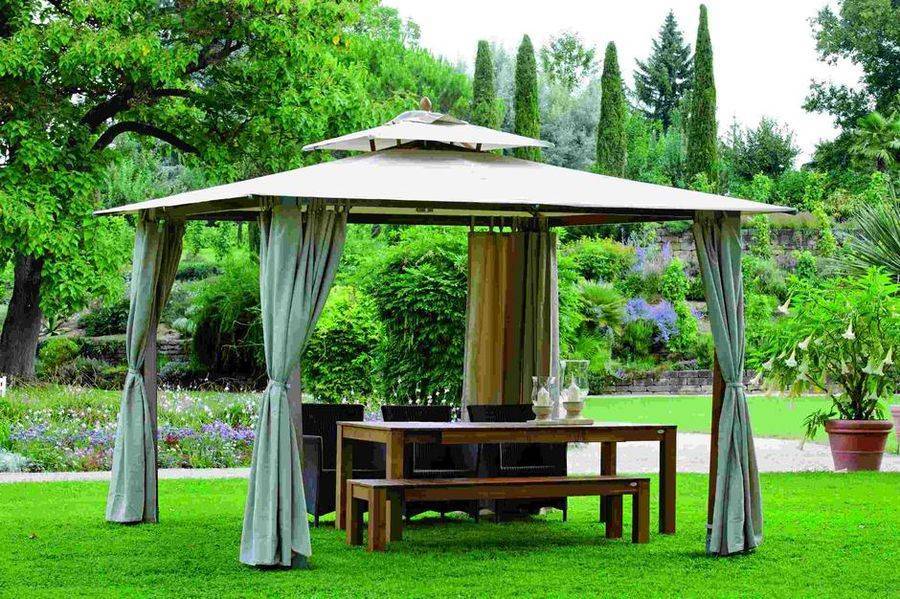 - беседки, имеющие покрытие крыши в виде тента, купола, обычной плоской крыши.