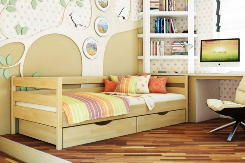 Оптимальный выбор – конечно же, кроватка из цельной натуральной древесины. Если говорить о конкретных сортах, то лидируют береза, ольха и клен, а более мягким, но и более бюджетным материалом является сосна