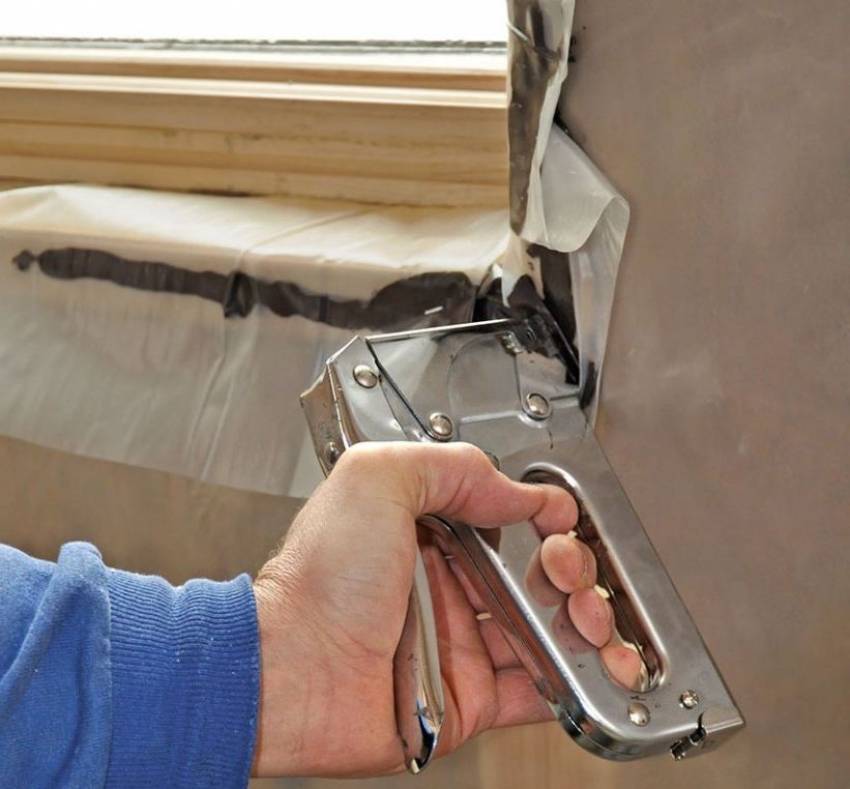 После того, как создан каркас, стоит определиться, как утеплить мансардную крышу. Изнутри к стропильной системе прикрепляется пароизоляционный материал. Для крепления пользуйтесь специальными строительными скобами.