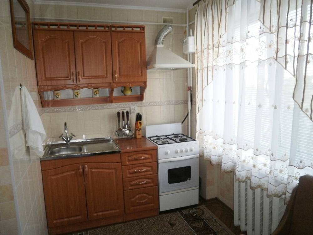 По двум сторонам «буквы»– кухонная мебельная стенка. Обеденный стол помещается у окна или по центру.