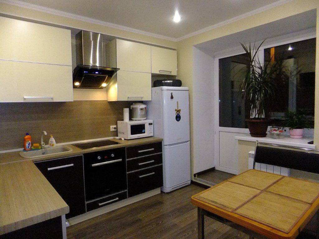 Г-образное расположение можно сделать, если дверь находится в углу. Дверь заменяется на арку, купе или в виде гармошки. Холодильник ставится возле дверного проема. Если место позволит, то можно приобрести Г-образный гарнитур, он имеет больше ящиков и шкафов для хранения.
