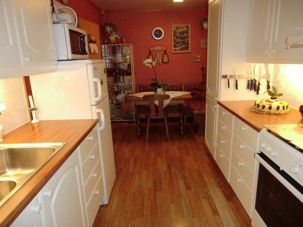 Если одна из стен в центре прерывается на дверь, то можно использовать двухрядную расстановку мебели. Тогда все шкафы и приборы распределяют вдоль двух противоположных стен.
