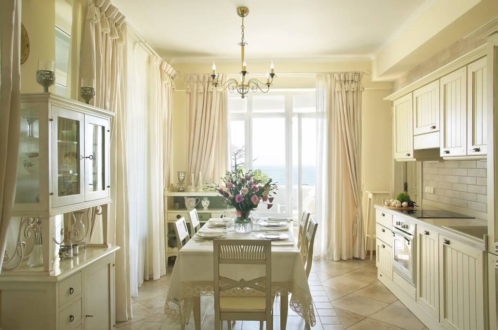 Отделка стен, текстиль и мебель обеденной зоны может быть выполнена в светлых тонах любого оттенка.