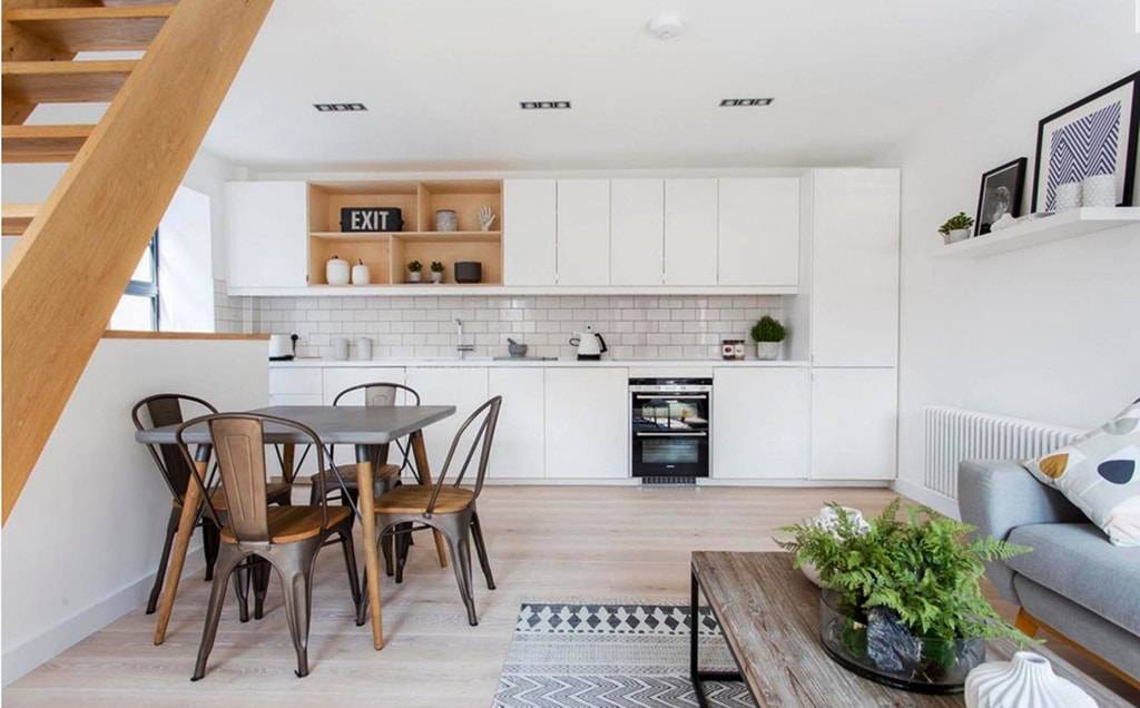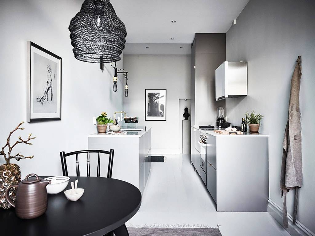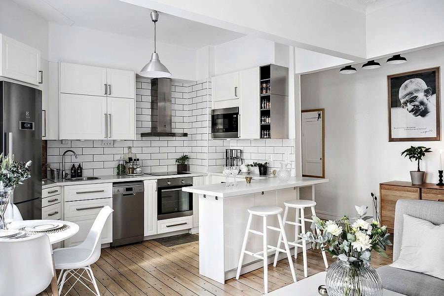 Белый цвет – его визитная карточка. Разбавленная яркими акцентами (желтым, синим и зеленым) скандинавская кухня-гостиная уже не создает ощущение неуютной и холодной.