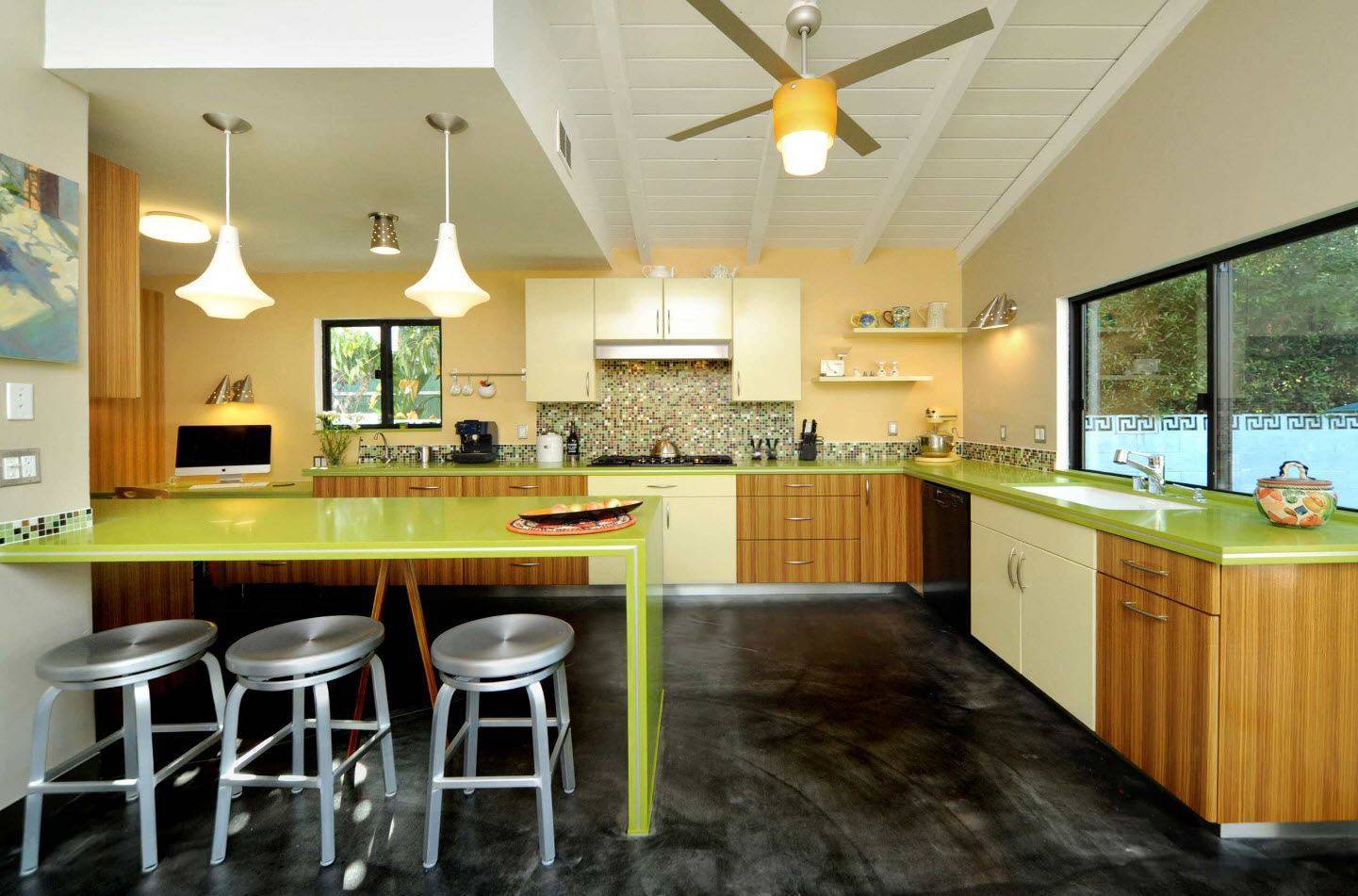 В зависимости от ваших потребностей в кухне устанавливается маленький или большой обеденный стол. Довольно часто вместо привычного большого обеденного стола устанавливают удлиненный прямоугольный стол или барную стойку. Это зависит от вашего вкуса и потребностей, количества членов вашей семьи, количества гостей которых вы принимаете.