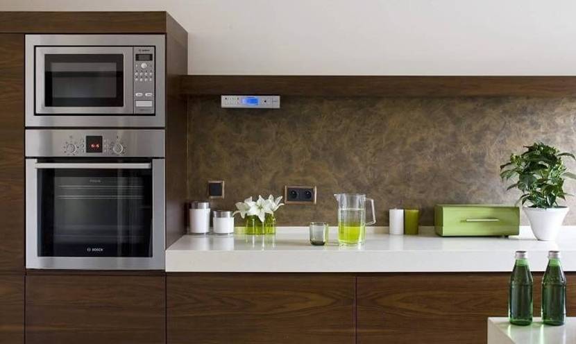 К вопросу приобретения бытовой техники также следует подходить ответственно. Если обеденную группу легко перенести в зону гостиной, то приборы должны оставаться строго на кухне. Исключение составляет холодильник, который можно с успехом разместить в соседней прихожей, если позволяет место. Всю остальную крупную бытовую технику для кухни лучше выбрать встраиваемую. Так предметы будут спрятаны под столешницами и будут смотреться менее громоздкими. При этом верхняя часть стола будет служить полноценный рабочей зоной.