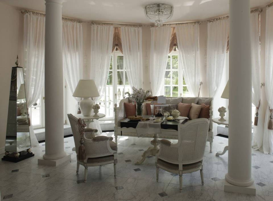Идеальным вариантом станет задрапировать большие окна французскими шторами и расположить в нише низкий диван с изогнутыми ножками.