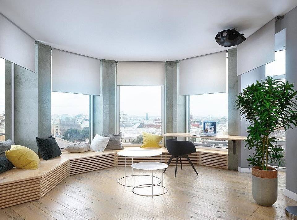 Для оформления окон в эркере гостиной современного стиля прекрасно подходят рулонные шторы