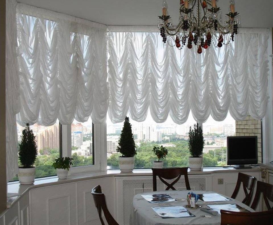 Для кухни с эркером подходят короткие легкие занавески, римские шторы или жалюзи.
