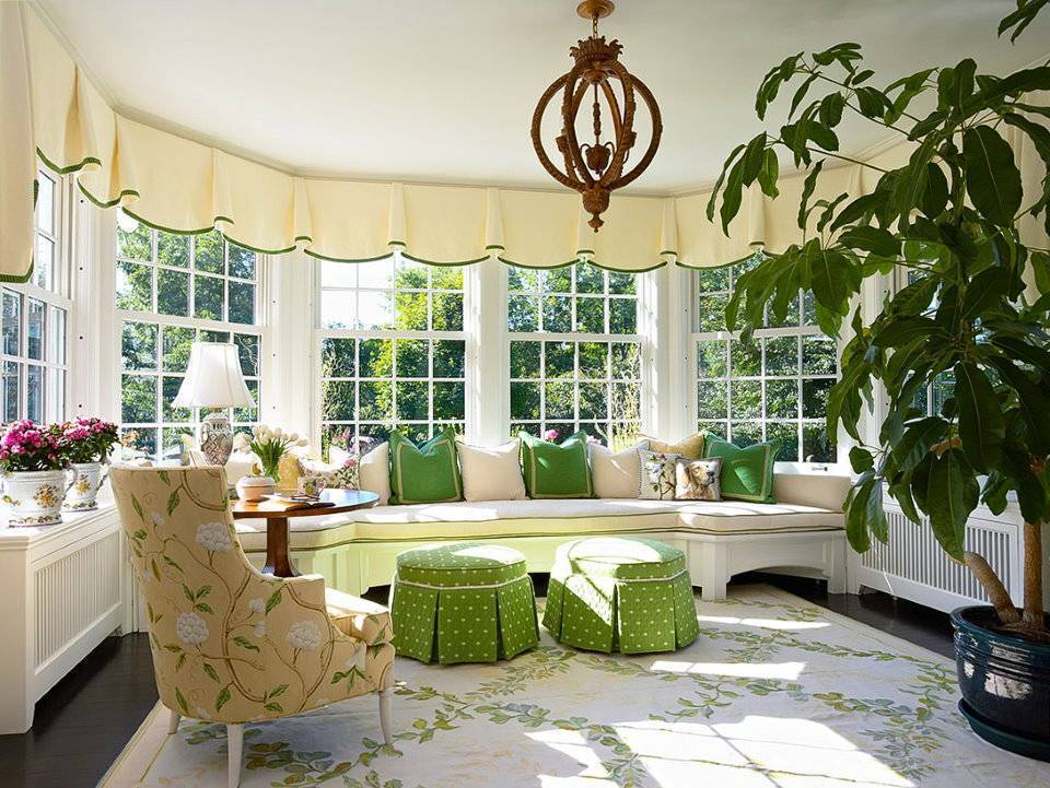 Обязательно займитесь декорированием оконных проёмов. Помните, что декорирование окон определит разнообразие штор, которое вы впоследствии сможете использовать. Задумайтесь, что вам ближе: рулонные жалюзи или стандартные, классические римские шторы, шторки для кафе, занавески-кантри, французские модели или другие. Существует возможность комбинирования вариантов занавесок. Однако помните, что ткань нужно использовать светлую и полупрозрачную, чтобы не ухудшить инсоляцию, которая создаётся благодаря дополнительным оконным проёмам в эркере.