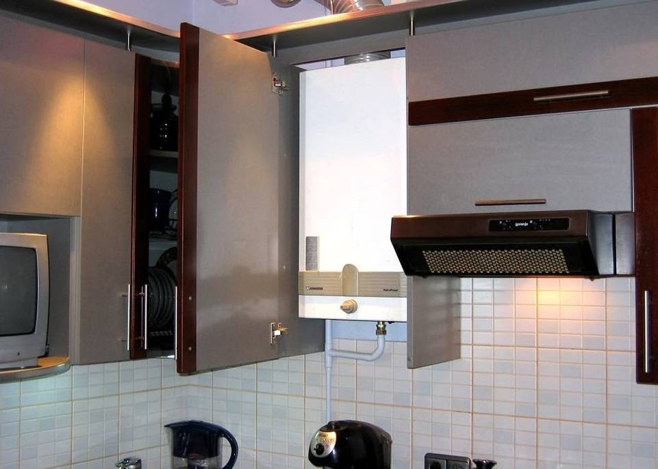 Обратите внимание! Дно и потолок шкафчика следует обязательно снять для обеспечения хорошей вентиляции. Если и кухонный гарнитур, и газовый котел уже установлены, можно замаскировать устройство самодельным шкафчиком из ДСП
