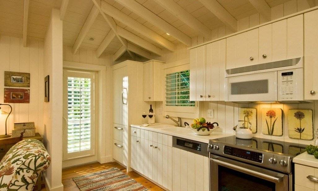 Максимальное использование стен, минимум декора. Выбор высокого шкафа, устанавливаемого возле входа, подвесных шкафчиков для зоны готовки обеспечит минимальное использование пространства. А вот декор должен быть небольшим и занимать минимум места.