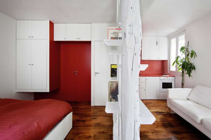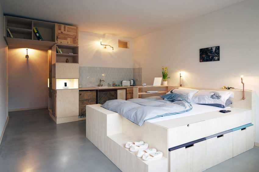 Подиум в квартире-студии 20 кв м – оригинальное решение для организации мест для хранения. Под ним можно установить выдвижные ящики и даже выдвижную кровать.