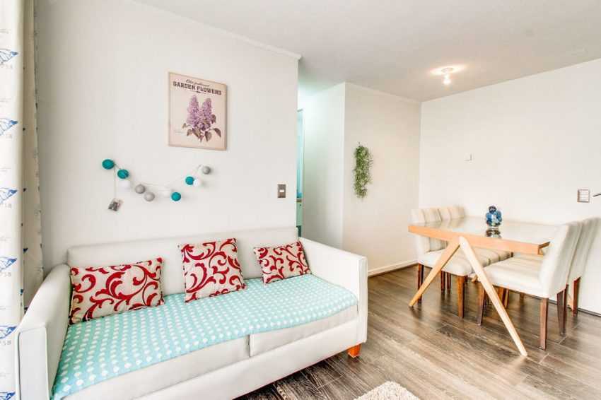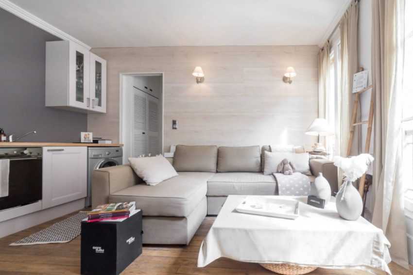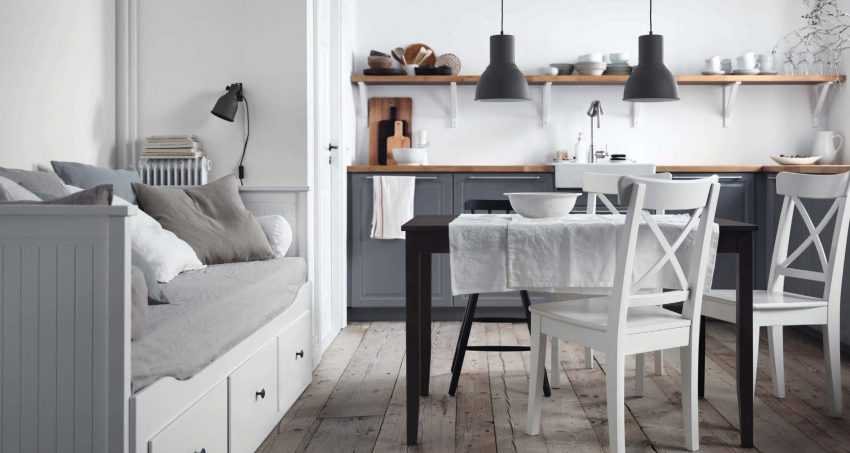 Самый простой и наименее затратный способ разграничить пространство – расположить мебель не у стен по периметру, а посередине комнаты – например, установив диван спинкой или перпендикулярно к кухонному гарнитуру.