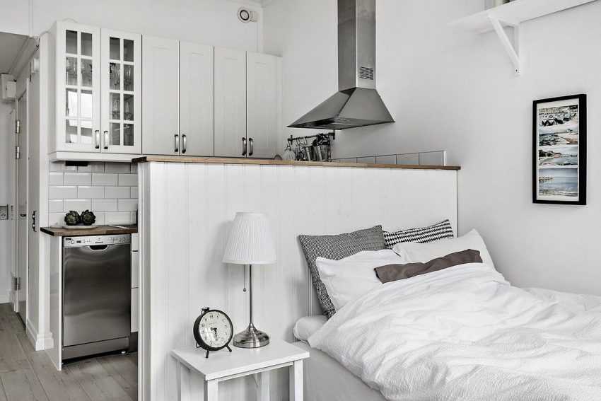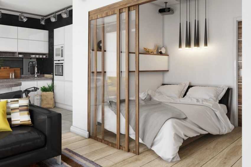 Для владельцев квартир-студий актуален вопрос зонирования не только кухни, гостиной и столовой, но и спальни, так как не все готовы использовать диван в качестве спального места на каждый день. Если необходимо отвести место в кухне-студии для кровати, то самым удачным способом является возведение перегородки.