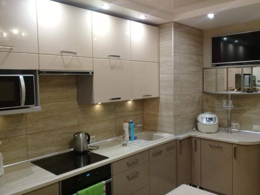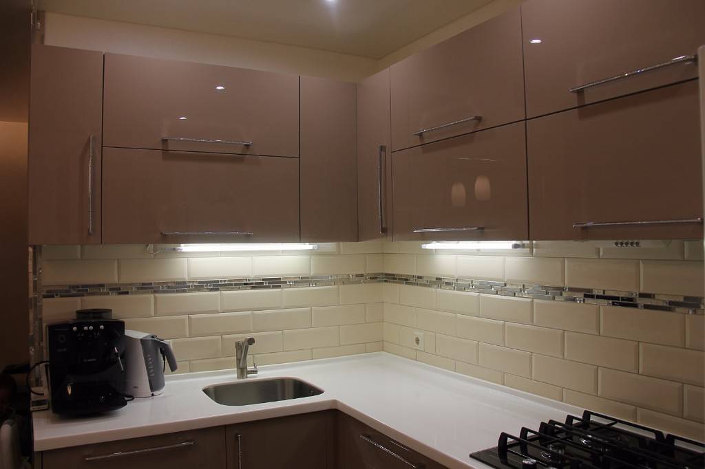 Можно подобрать цвета под натяжные потолки. При выборе такого решения можно заказать фотопечать на пленку, в которой будут использованы оба цвета гарнитура. При этом фактура пленки может быть похожей с фасадами шкафов либо, наоборот, разниться с ними. Глянец на шкафчиках и напольных столах отлично сочетается с матированным и сатиновым покрытием натяжного полотна.