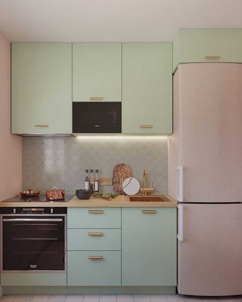Отделка выполняется в светлых оттенках, рекомендуем рассмотреть пастельную палитру красок. Не стоит выбирать яркие и темные тона, они визуально уменьшают и без того небольшую площадь. Зону приготовления оформляют небольшим фартуком. Отлично будет смотреться плитка кабанчик.
