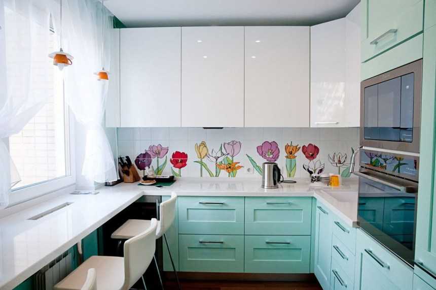Можно сделать главным декоративным элементом «фартук» над рабочей поверхностью. Он может быть стеклянным или выложенным мозаикой. Такой декоративный элемент украсит дизайн маленькой кухни 4 кв м, а также добавит глубины в современный и стильный интерьер.