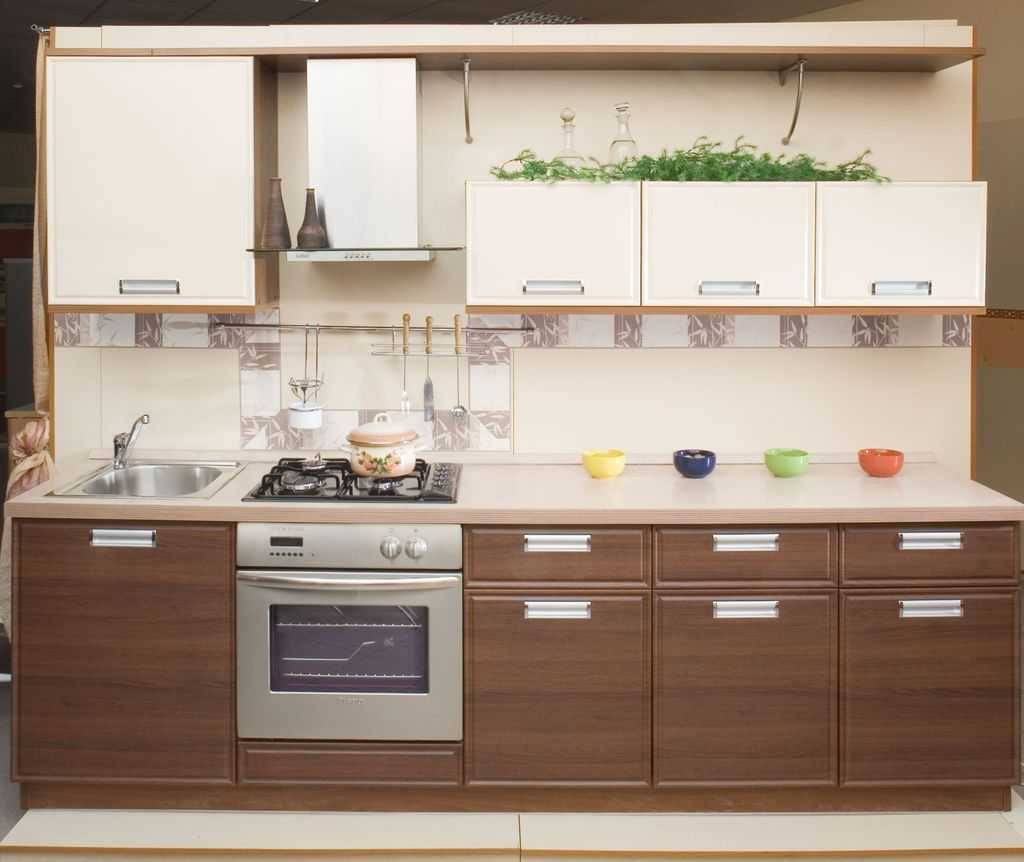 Древесина или отделочный шпон подойдут только самых светлых оттенков, так как темные цвета буквально сжимают пространство. Есть специальные гарнитуры-кухни для маленькой кухни хрущевки, компактные и состоящие из небольшого набора предметов, которые можно установить в одну линию.