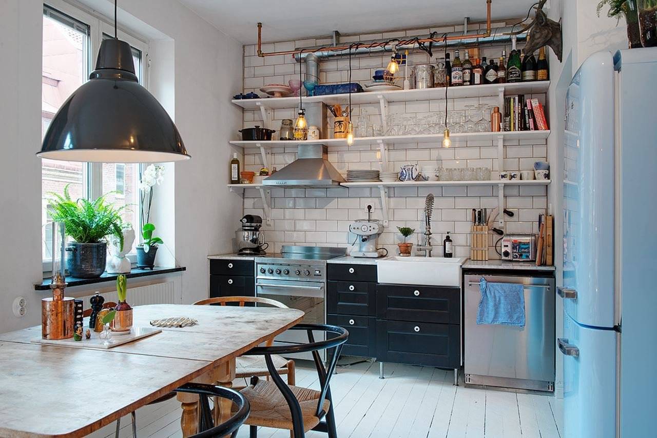 От встроенного варианта лучше отказаться: он будет неуместно смотреться на такой кухне. Отличным дополнением к лаконичному стилю станут изделия ручной работы. Лучше всего будут смотреться вещи, сделанные в стиле стим-панк или на промышленную тематику.