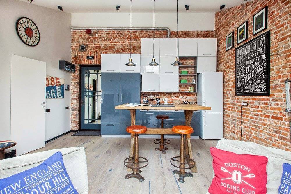 Современный концепт лофта отличается от того, который был зарожден в Америке более аккуратной эстетикой. Например, это касается кирпичной кладки. Она более аккуратная, стилизованная, чем у настоящей ветхой кладки. Если в конструкциях отсутствует кирпичные стены, тогда их создают искусственно. Такой маневр помогает подчеркнуть стиль лофт грубостью неотделанной стены. Кирпич лучше брать облицовочный любого оттенка:
