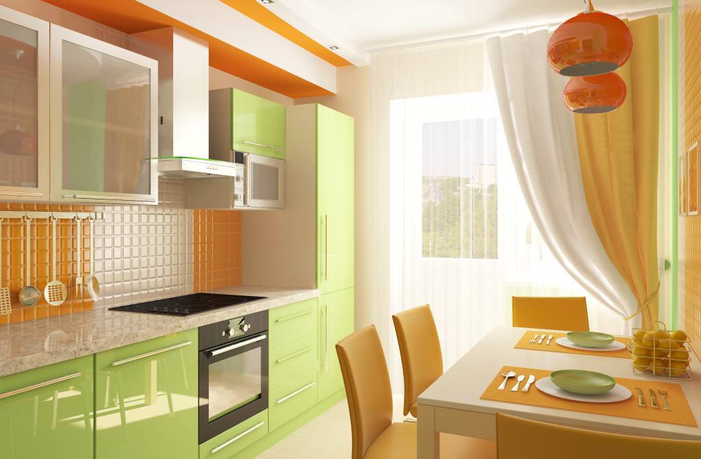 Главный предмет мебели на кухне – гарнитур, на фоне сдержанных стен может быть насыщенных цветов.
