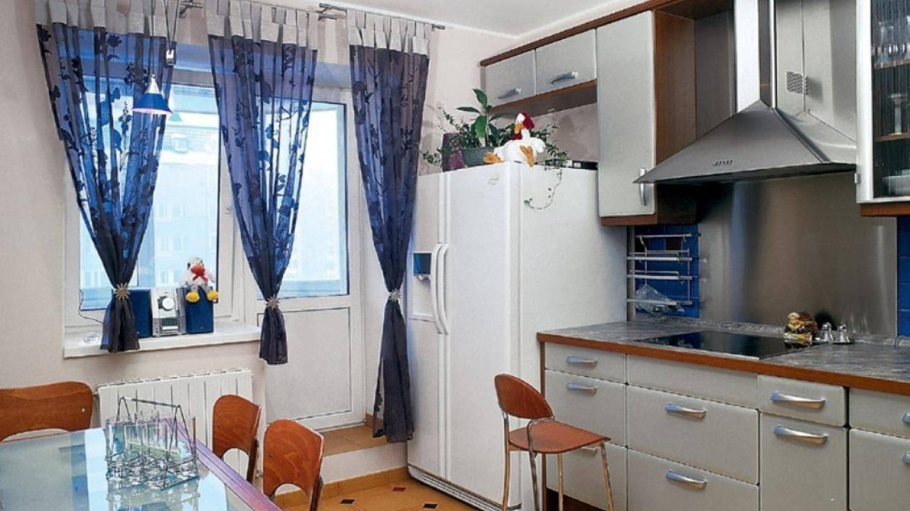 Выделение в типовой квартире кухни-гостиной позволяет провести четкое разграничение между приватной и общественной зонами. Визуально расширить пространство при объединении гостиной и типовой кухни, которая имела Г-образную вытянутую форму с двумя окнами, позволила установка стеклянной стены.