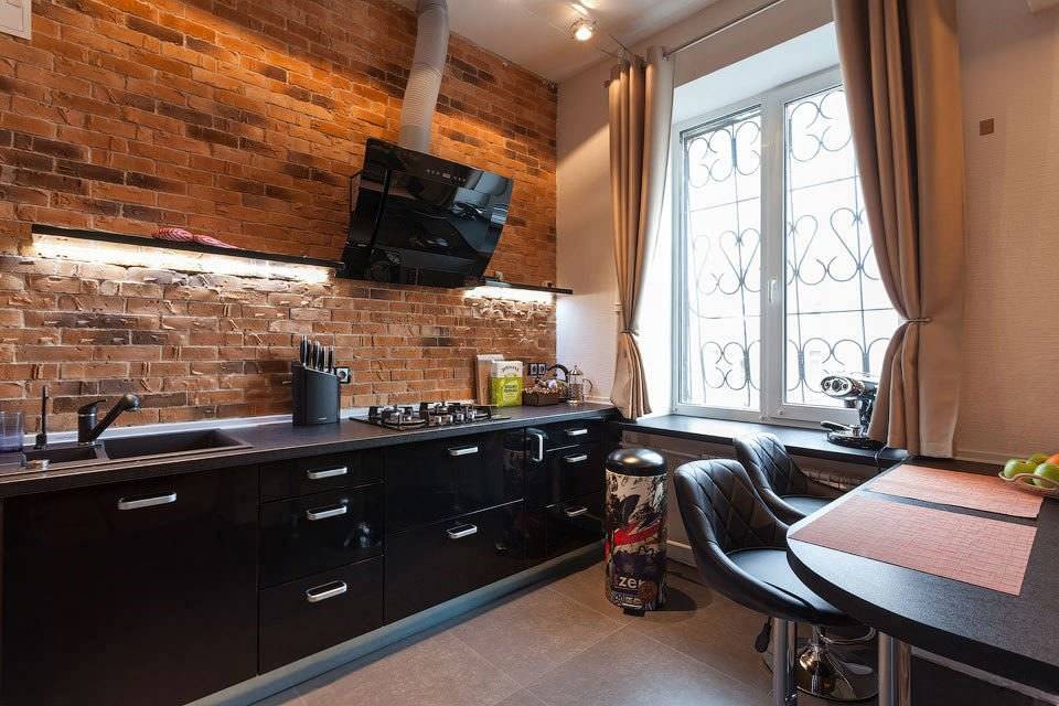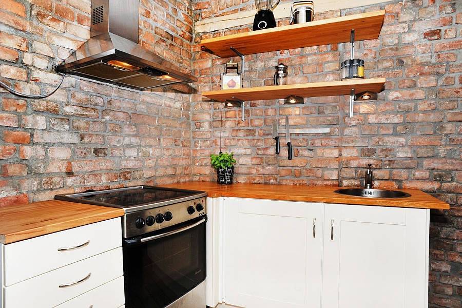 В современных квартирах без отделки можно оставлять и кирпичные, и бетонные стены. В первом случае потребуется аккуратно удалить старые обои, плитку. Затем нужно зачистить поверхность, оставляя открытыми материалы основания. Для кухонь, оформляемых в стиле лофт, кирпичные стены рекомендуется оставлять для участков, расположенных по бокам и напротив рабочей зоны. Сама рабочая зона должна располагаться под стенкой с более практичной отделкой. В противном случае хозяевам придется постоянно очищать кирпич от оседающего жира и пыли. Бетонные стены можно дополнительно не выравнивать. Незначительная рельефность лишь придаст готовому оформлению особую изюминку. Дополнительно бетон можно покрыть шпаклевкой, смешанной со специальным колером. Можно использовать и матовую краску. Составы, которые после высыхания становятся глянцевыми, для такого направления не подойдут.