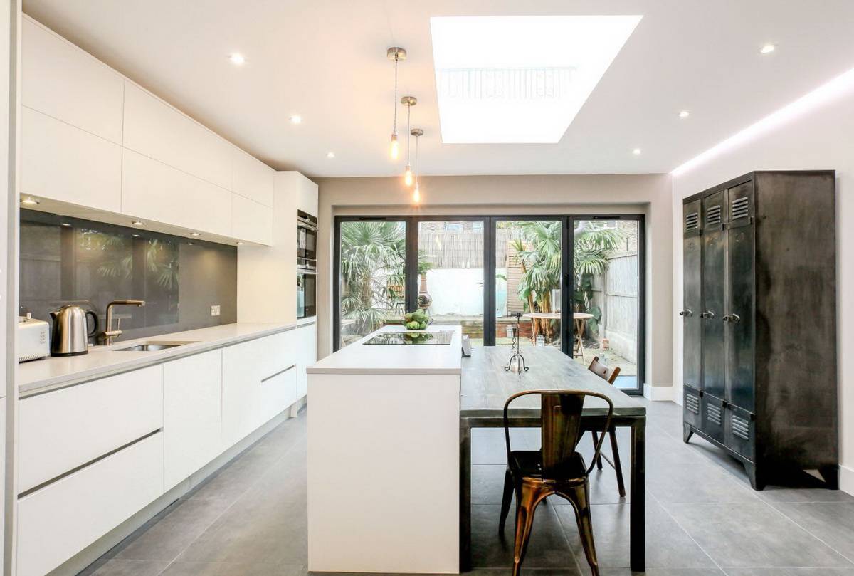 В таких кухнях очень важен свет, поэтому понадобятся и окна больших размеров, и множество разнообразных светильников. Это позволит помещению стать более просторным, легким, живым.