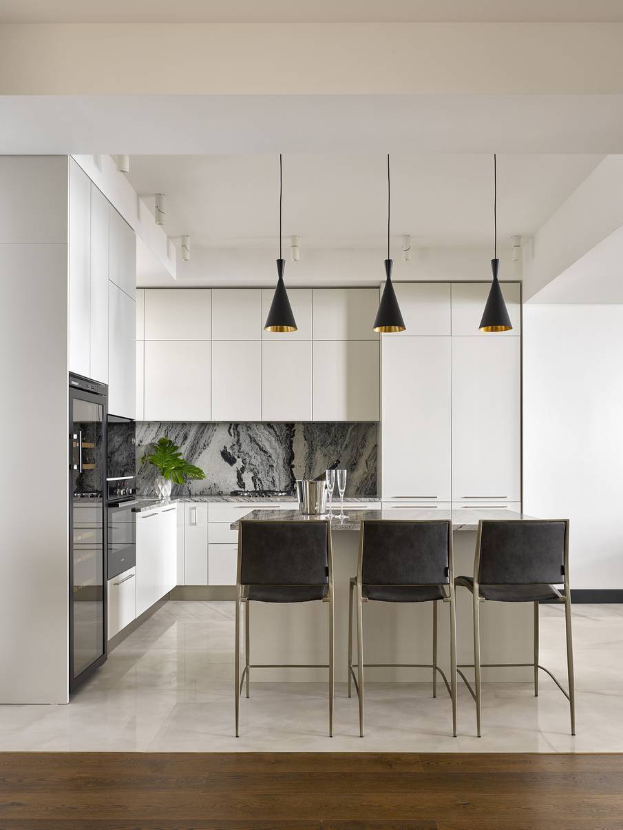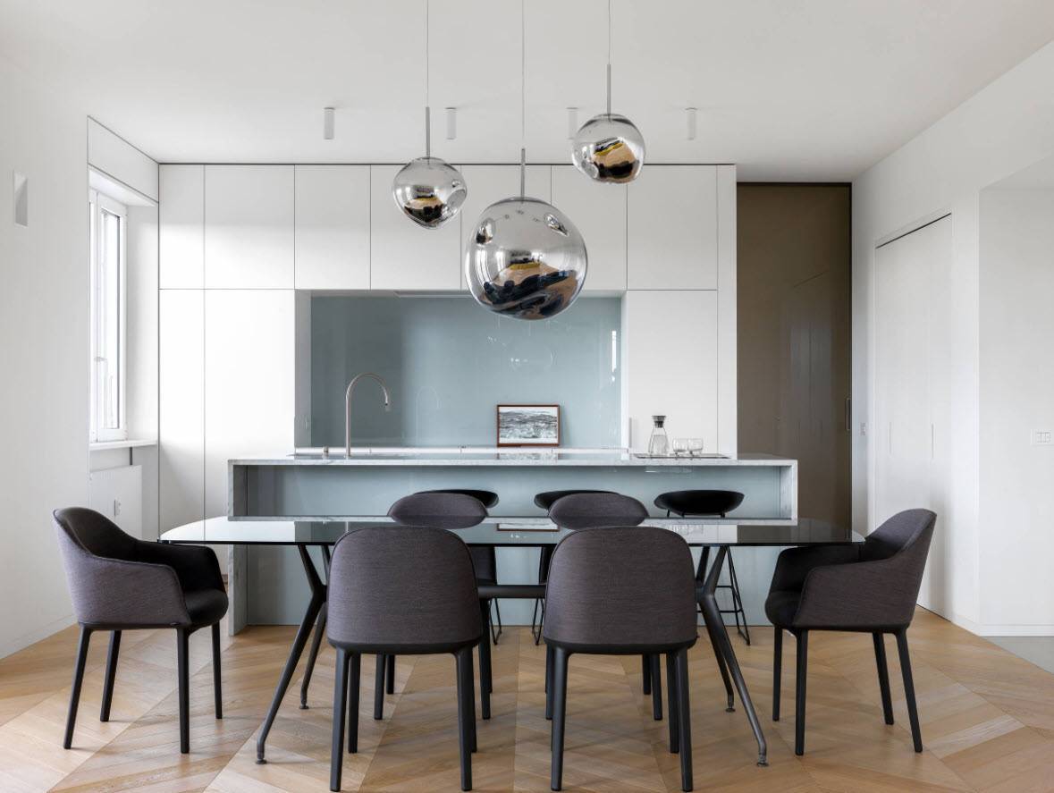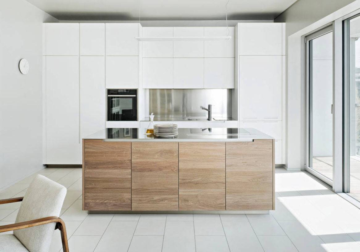исключительно холодная цветовая гамма, разбавленная «теплым» деревом – как видите, и это не всегда так; ведь вся эта ледяная композиция может заиграть при помощи ярких стульев, фартука или небольших и немногочисленных предметов декора;