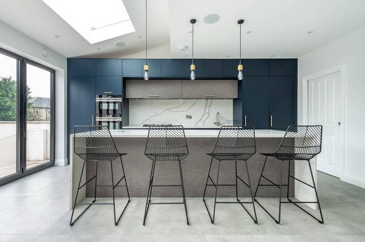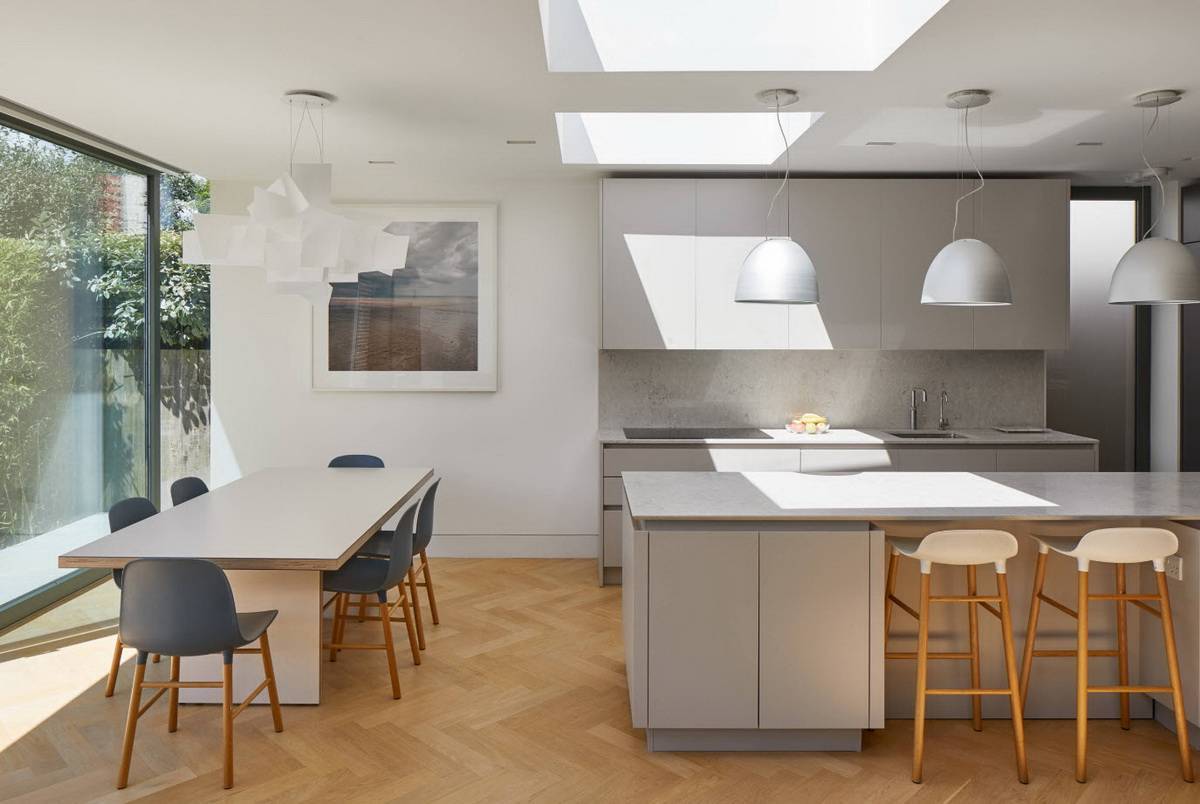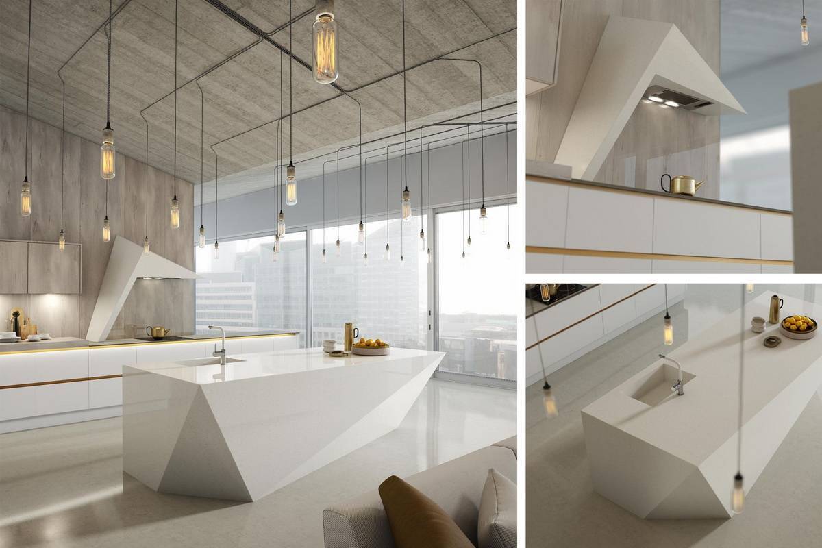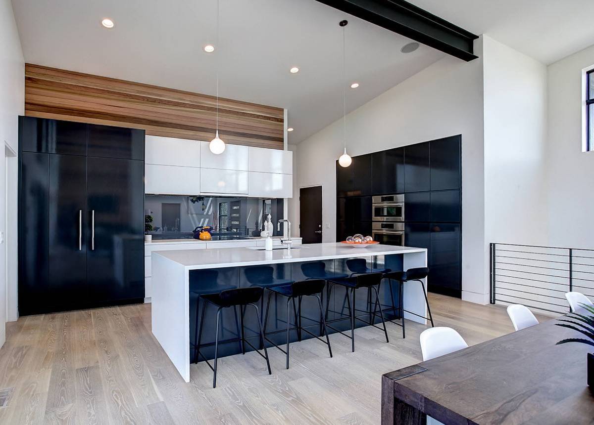 исключительно холодная цветовая гамма, разбавленная «теплым» деревом – как видите, и это не всегда так; ведь вся эта ледяная композиция может заиграть при помощи ярких стульев, фартука или небольших и немногочисленных предметов декора;