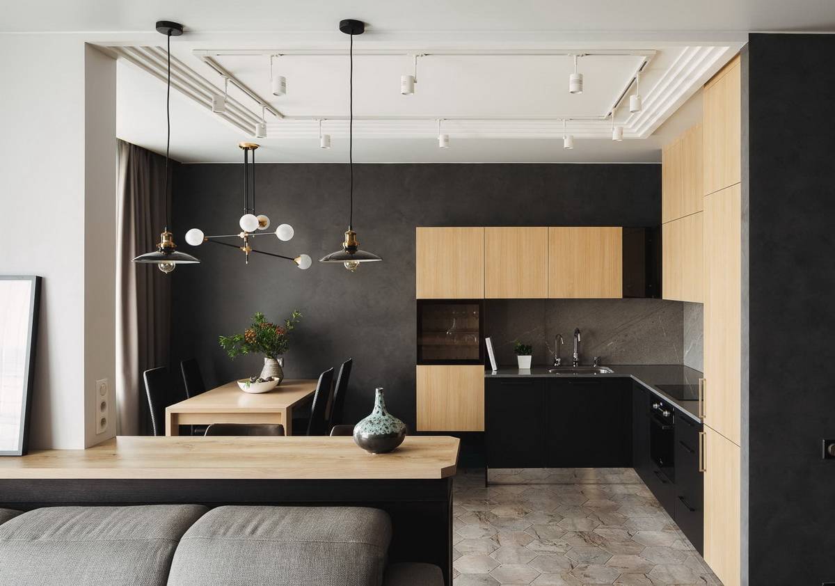 Потолок должен быть светлым, лучше матовым, но уместен и глянец. Он может быть покрыт штукатуркой или краской, оптимален натяжной потолок, а если высота позволяет, то кухню-гостиную лучше разграничить гипсокартонным двухуровневым потолком. Ниже — фото (листайте вправо).