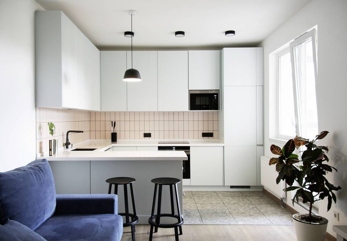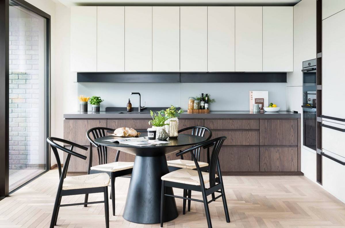 Стены, в том числе фартук, должны быть однотонными, идеально ровными, лаконичными. Уместны стеновые панели, покраска, крупная керамическая плитка без узора. Обоями можно выделить акцентную стену в рабочей или обеденной зоне.